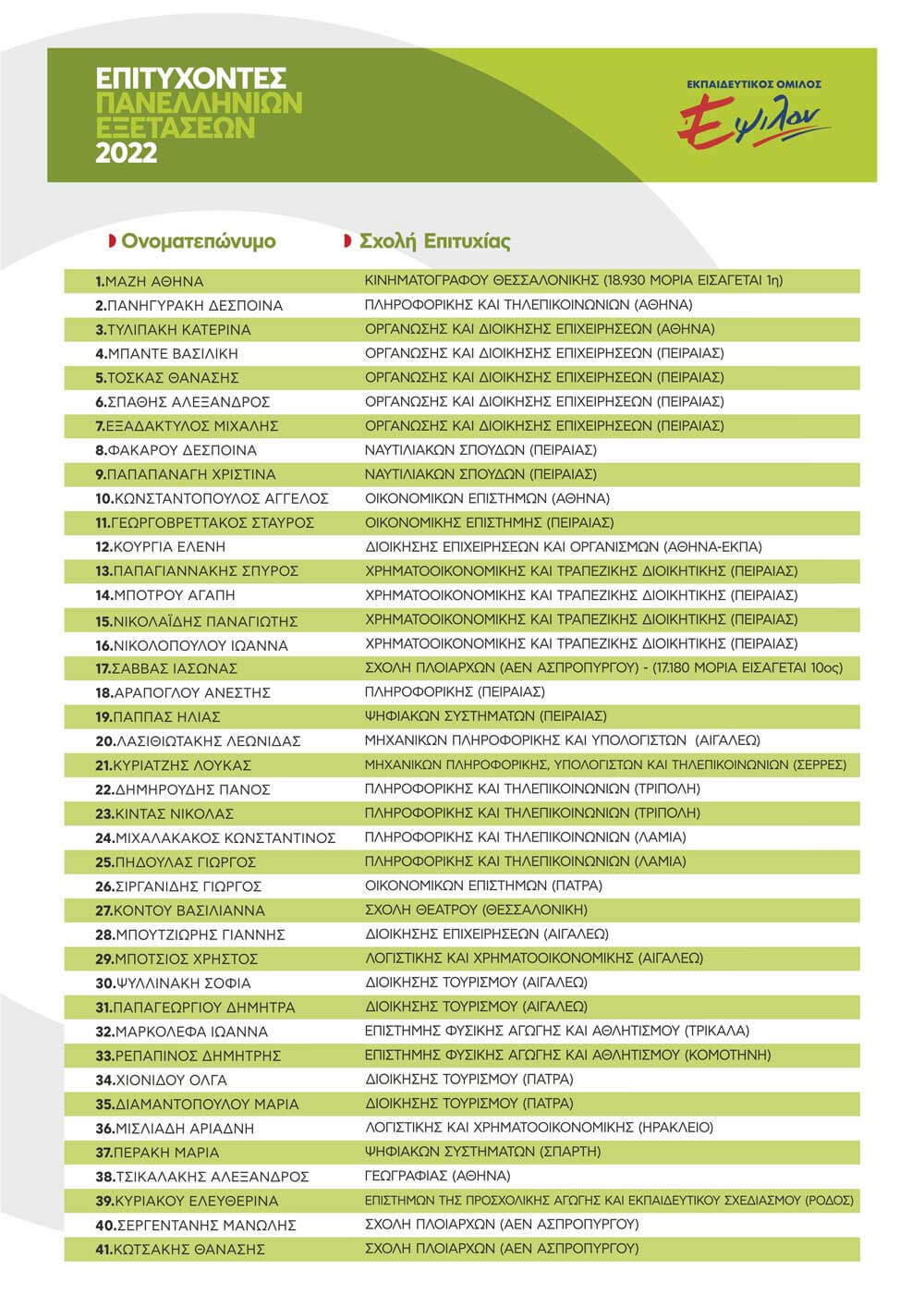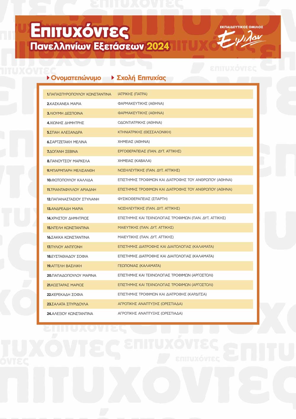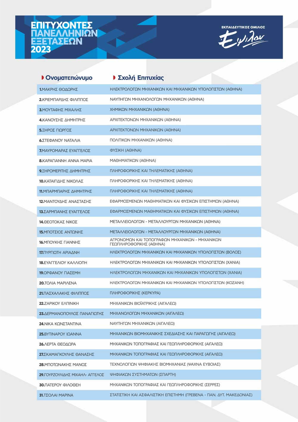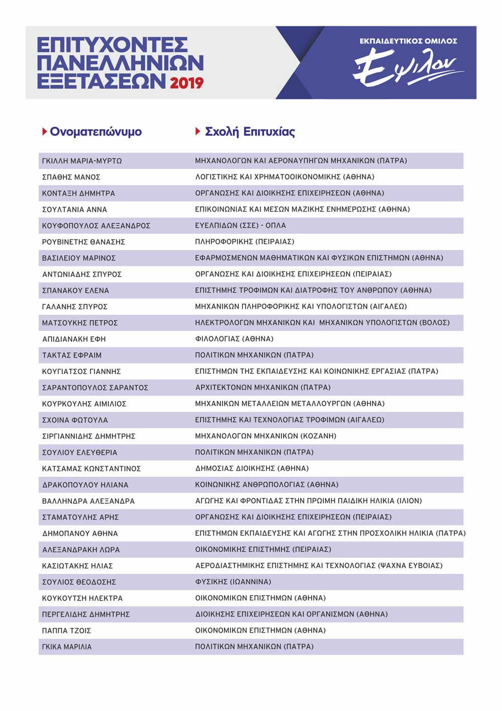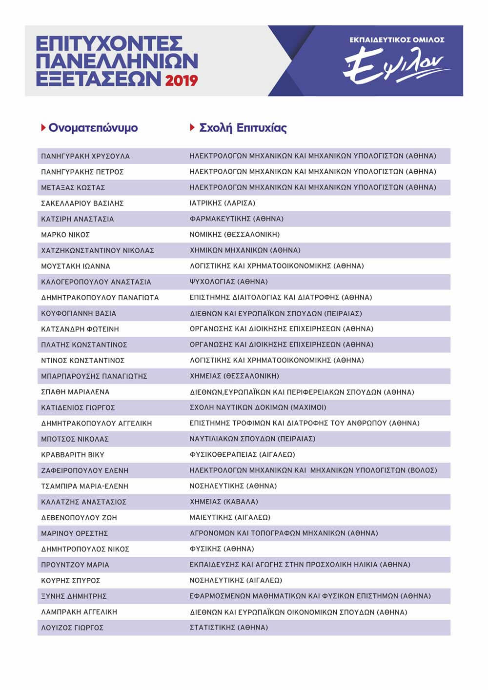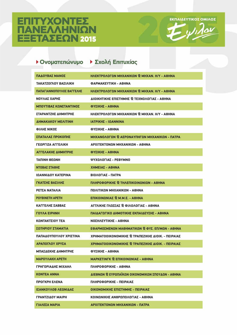 ΠΙΝΑΚΑΣ ΕΠΙΤΥΧΟΝΤΩΝ ΑΝΑ ΕΤΟΣ