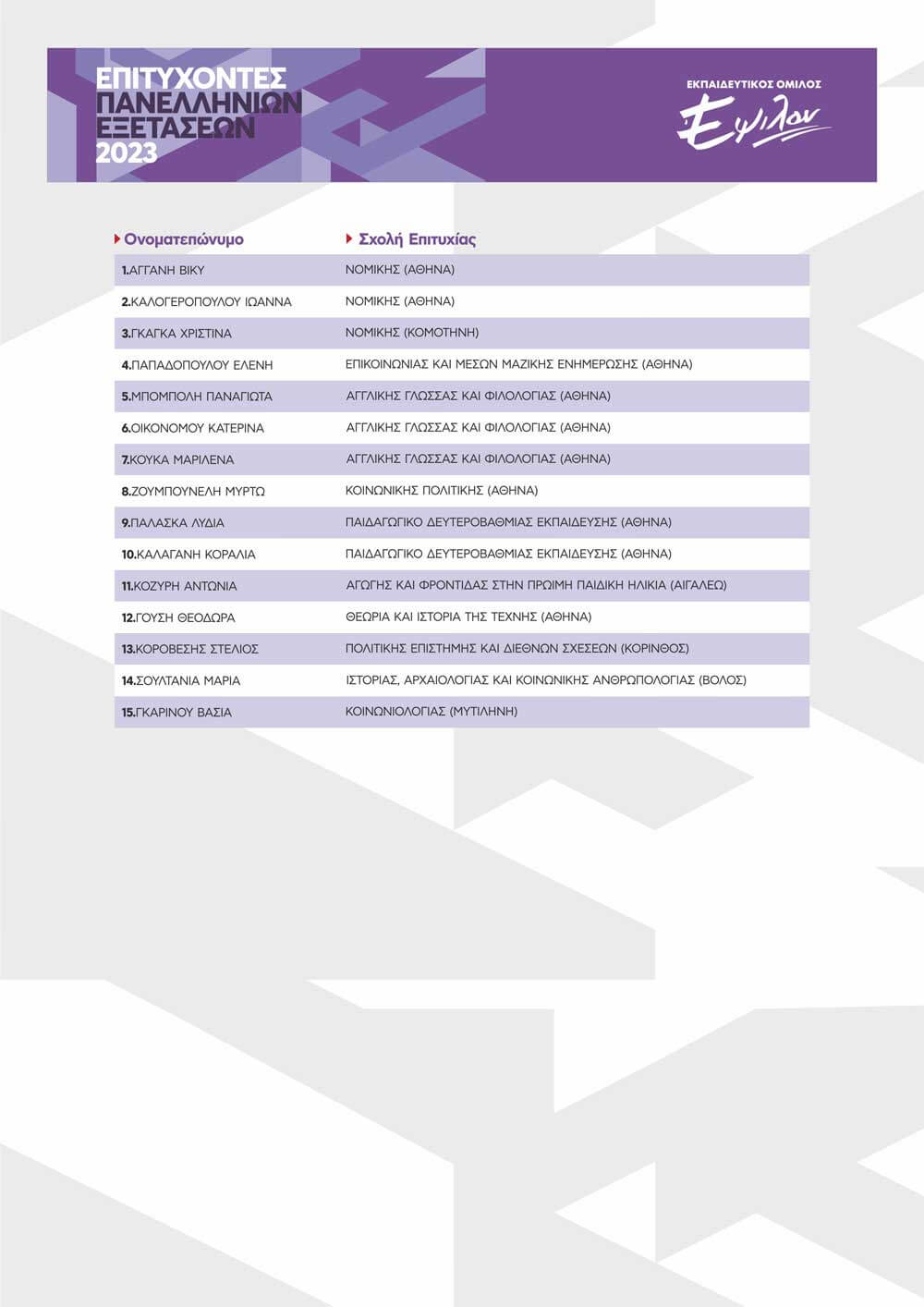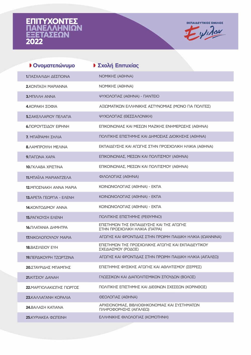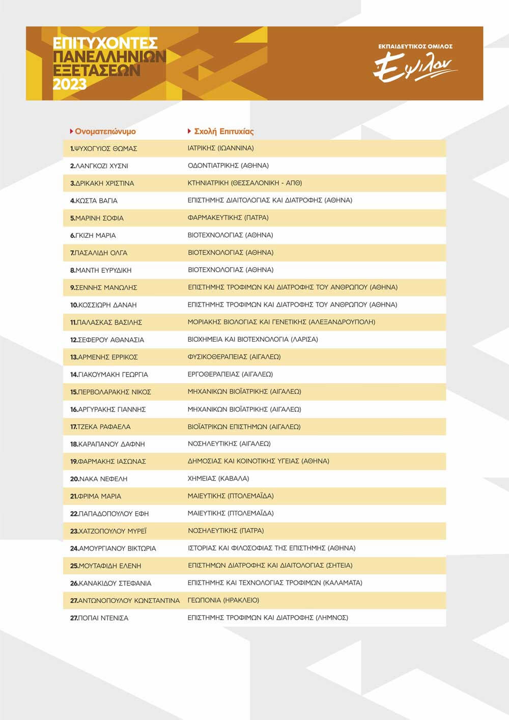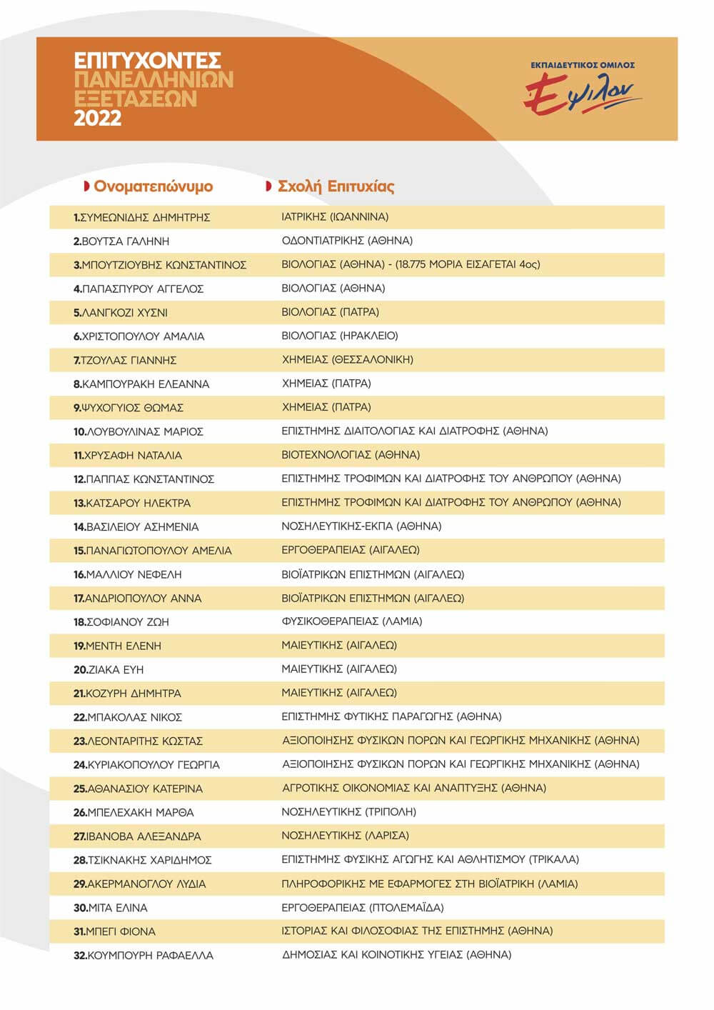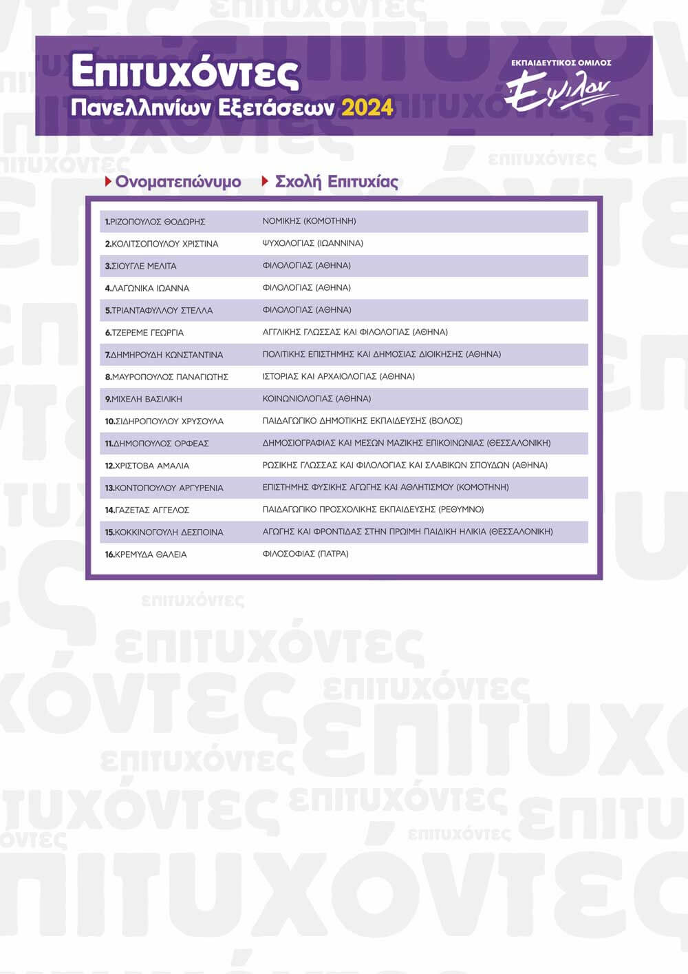 ΠΙΝΑΚΑΣ ΕΠΙΤΥΧΟΝΤΩΝ ΑΝΑ ΕΤΟΣ